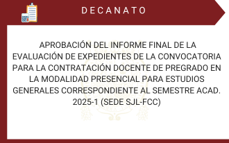 comunicadosAPROBACIÓN DEL INFORME FINAL DE LA EVALUACIÓN DE EXPEDIENTES DE LA CONVOCATORIA PARA LA CONTRATACIÓN DOCENTE DE PREGRADO EN LA MODALIDAD PRESENCIAL PARA ESTUDIOS GENERALES CORRESPONDIENTE AL SEMESTRE ACAD. 2025-1 (SEDE SJL-FCC) WPcontabilidad / 24 de marzo de 2025